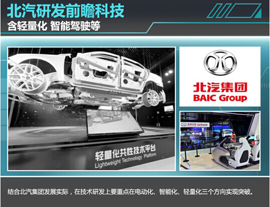 近年來北汽集團通過發展企業轉型升級,已成功躋身世界500強企業之一。2014年底旗下北汽股份實現在港掛牌上市,令北汽集團再度觸動業界神經。隨著北汽戰略的不斷深化落地、企業已開始從逐漸在新能源車、互聯網+等產業領域有著重大成果,結合北汽集團發展實際,在技術研發上要重點在電動化、智能化、輕量化三個方向實現技術突破。在不久前開幕的第十八屆中國北京國際科技產業博覽會(以下簡稱科博會)上,北汽集團針對車身輕量化、智能駕駛等前瞻技術進行全面展示。